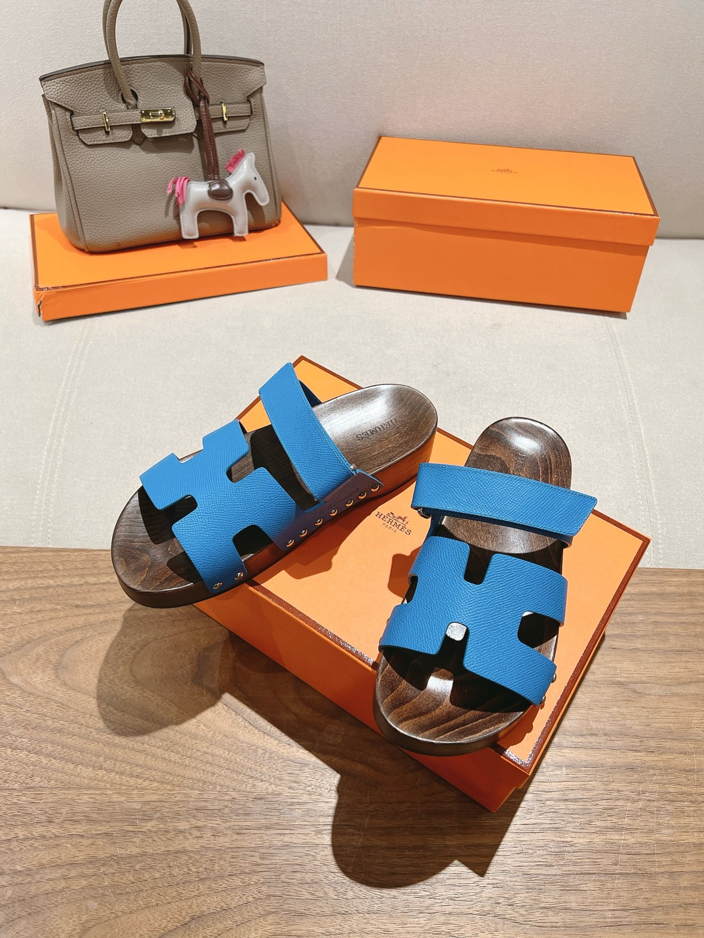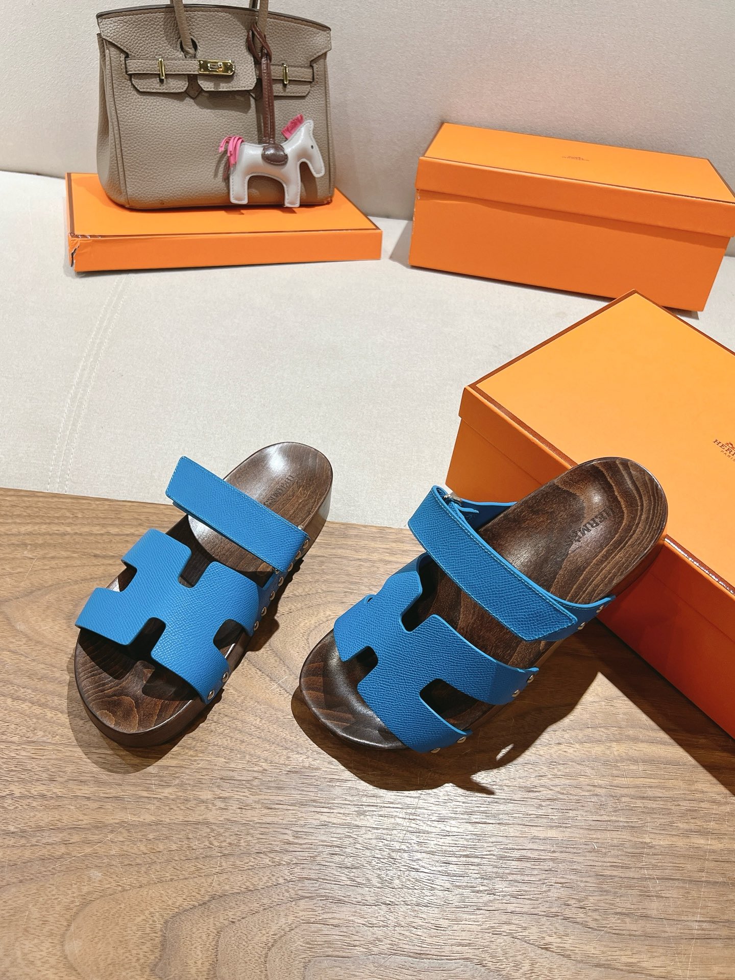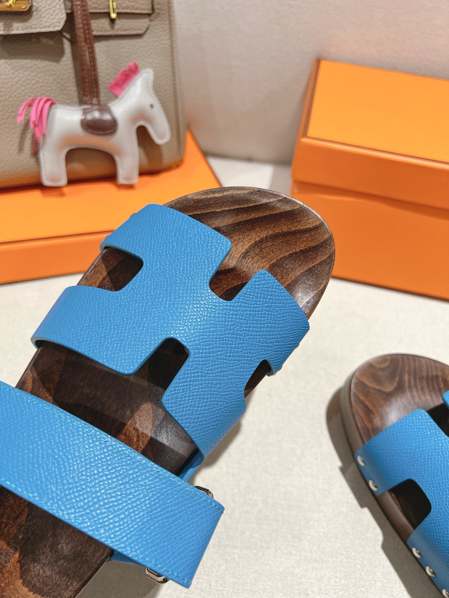 Blue Hermes Ankara leather slippers with brown patterned sole