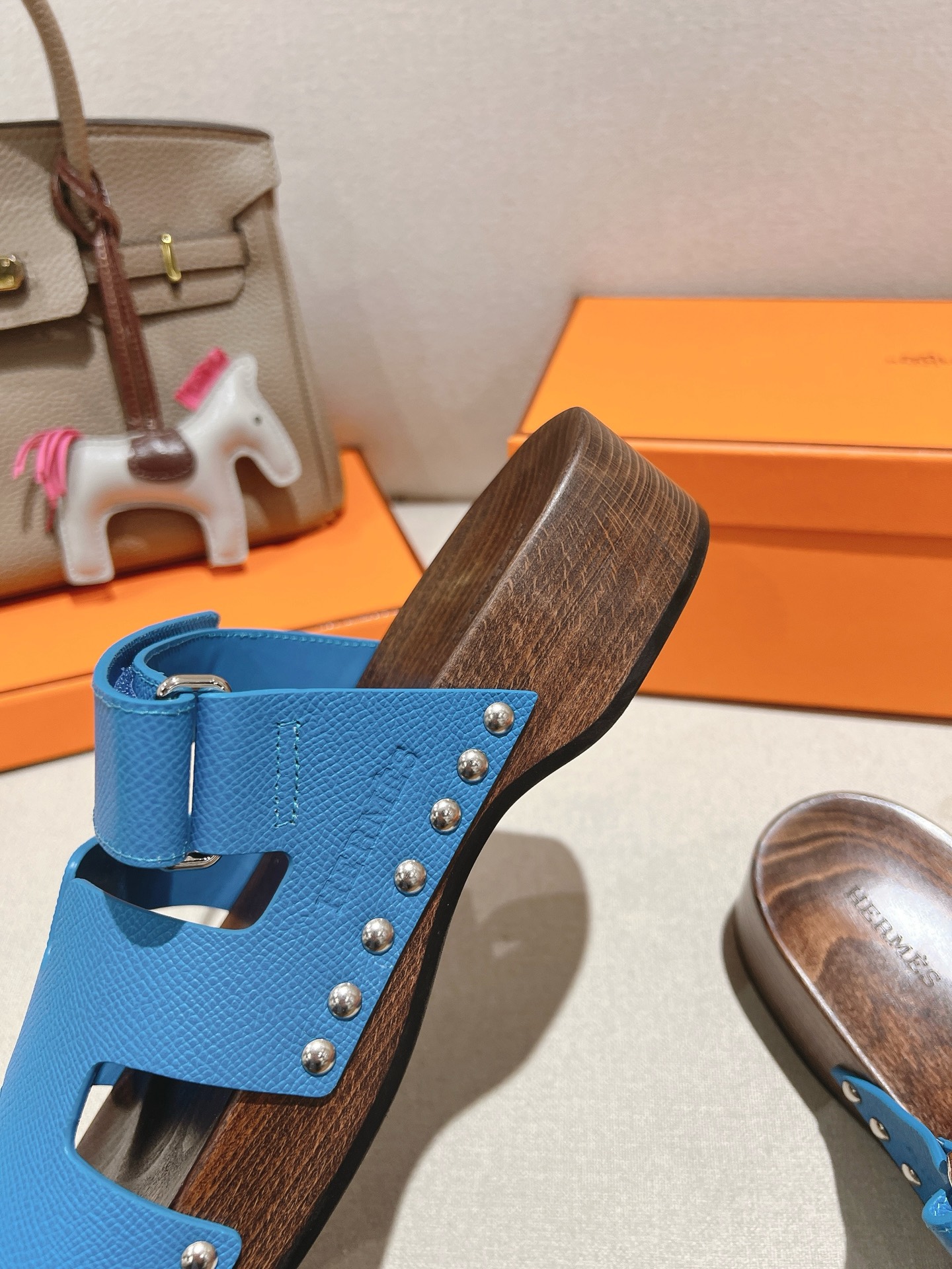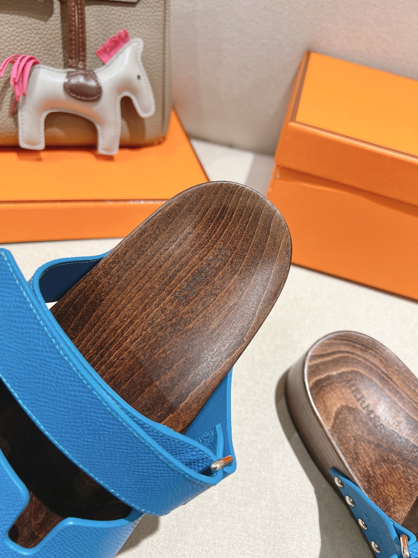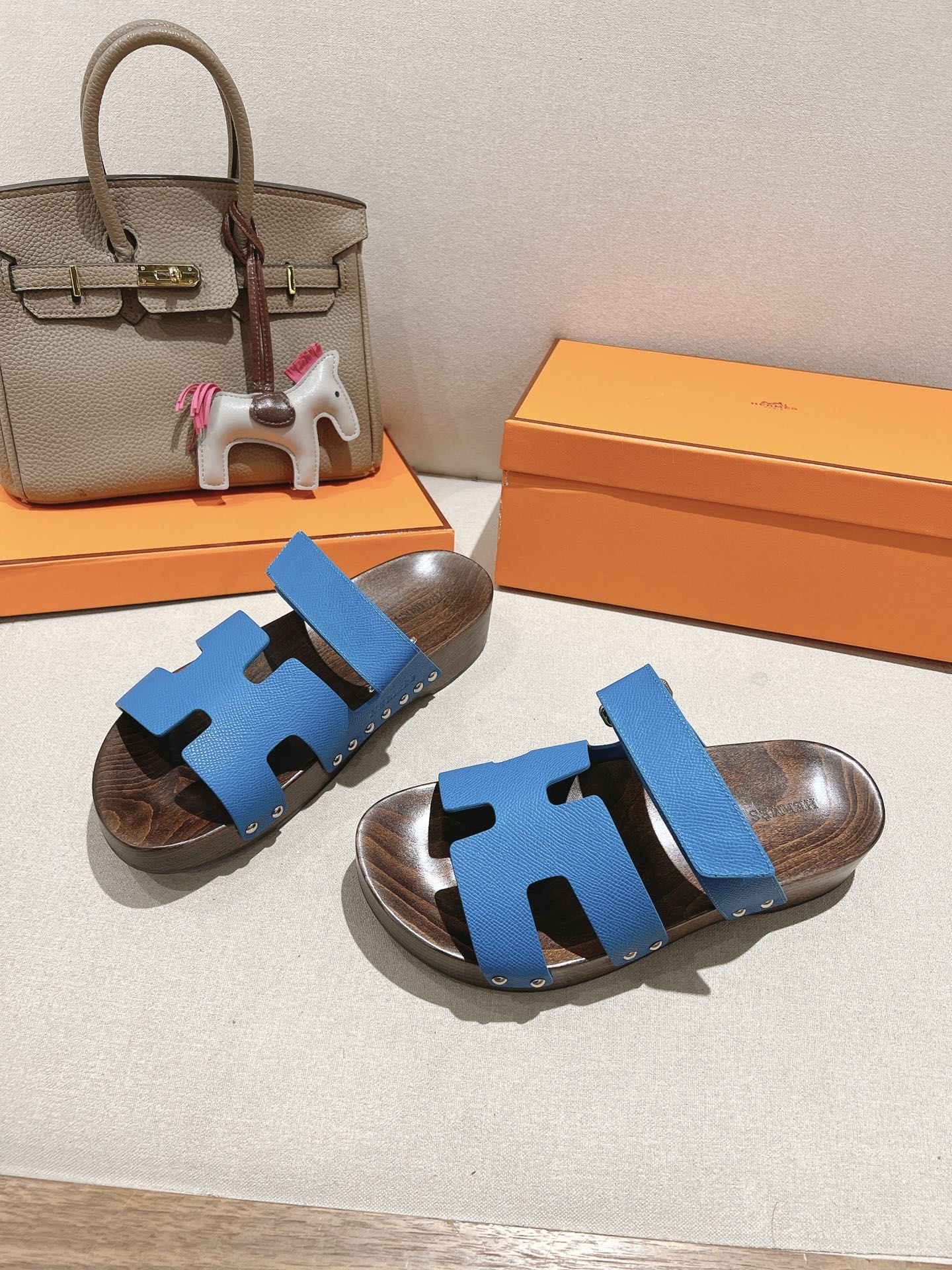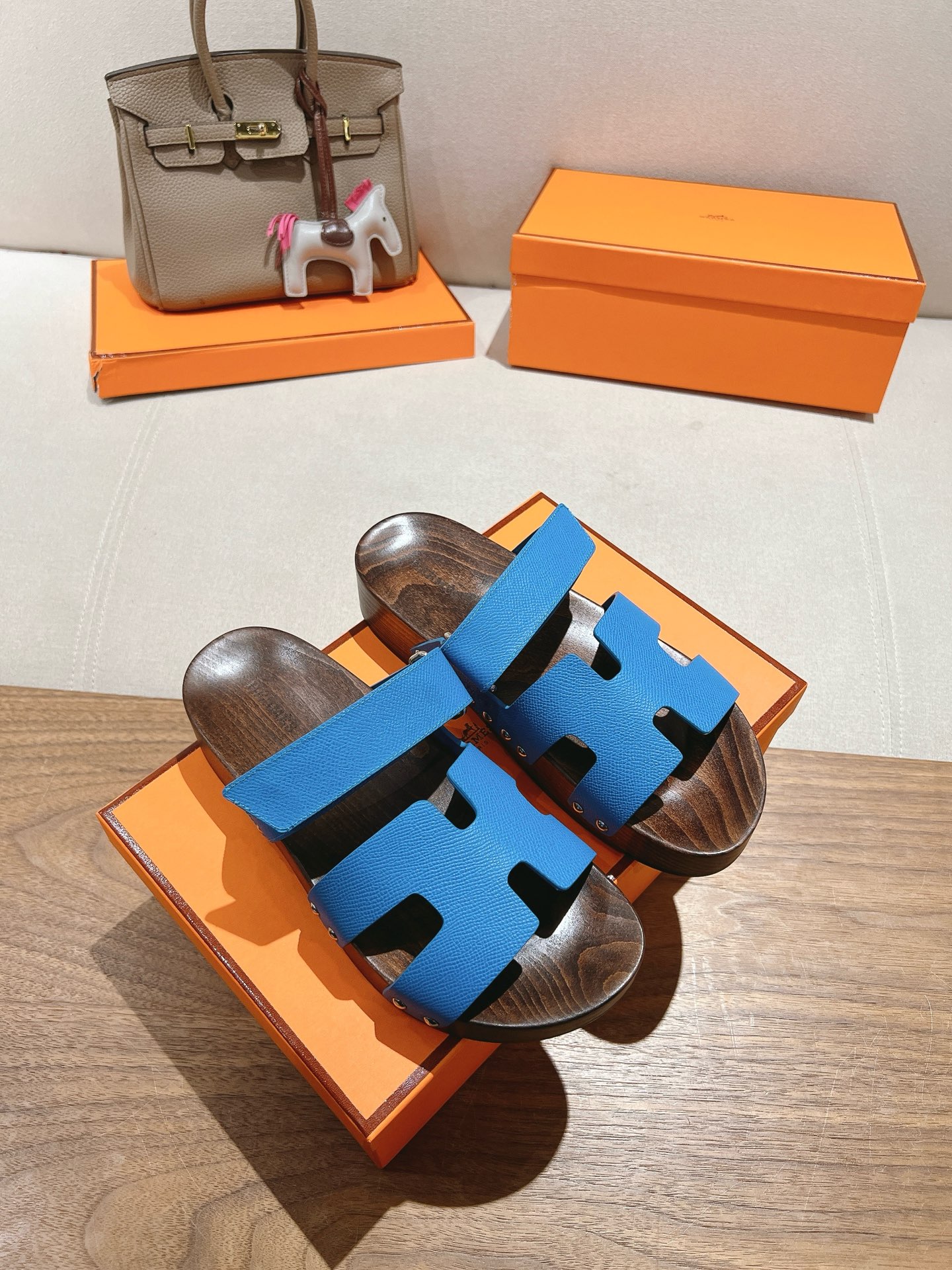 Blue Hermes Ankara leather slippers with brown patterned sole