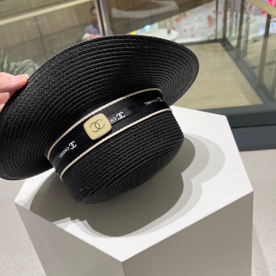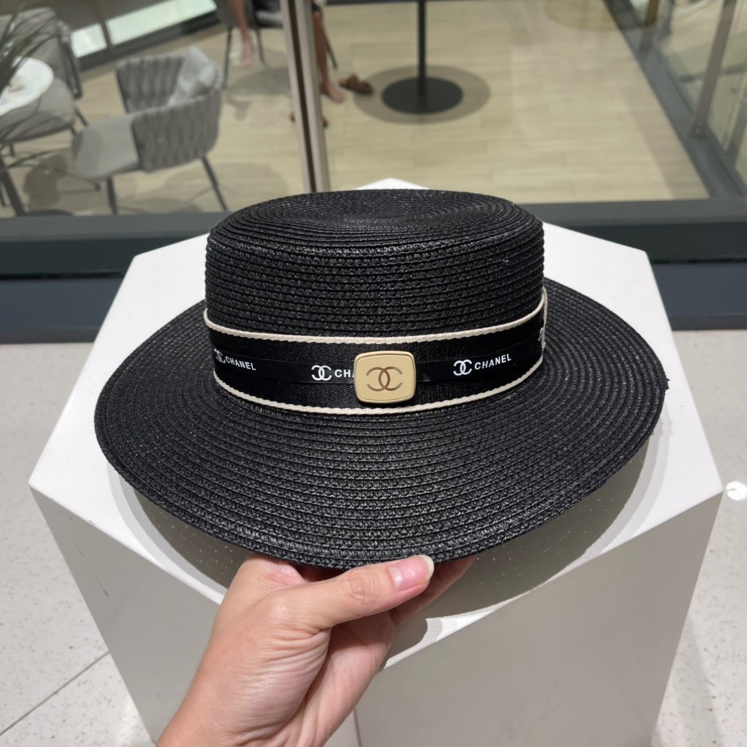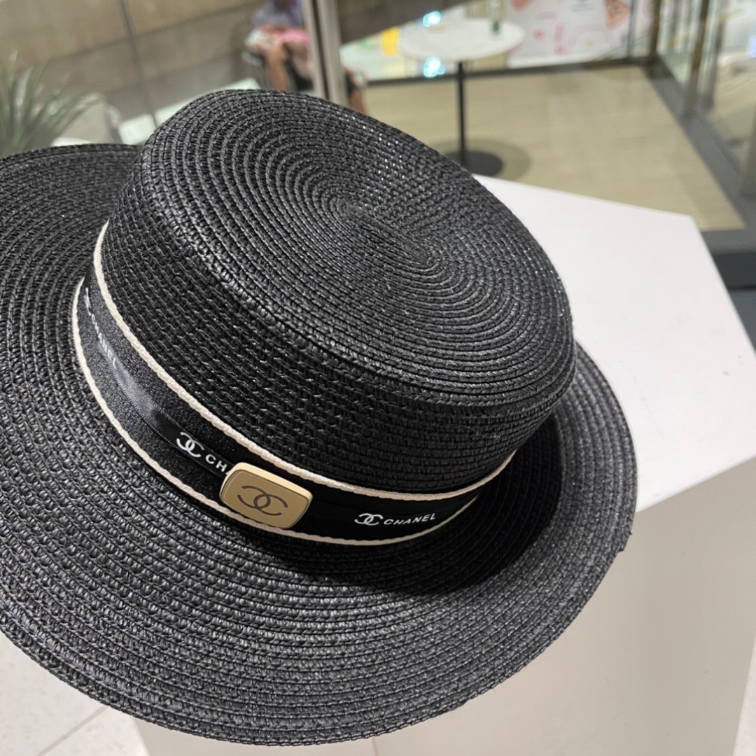 Chanel Black Straw Boater Hat with Black Ribbon and Gold CC Logo