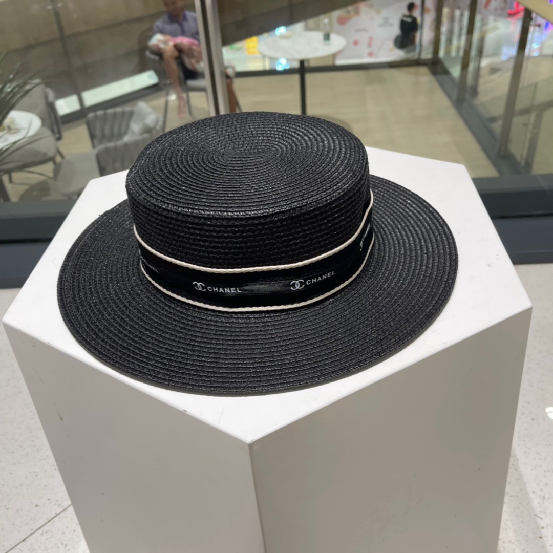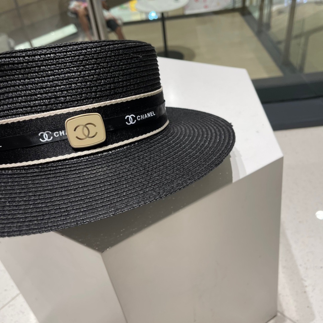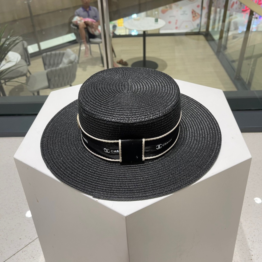 Chanel Black Straw Boater Hat with Black Ribbon and Gold CC Logo