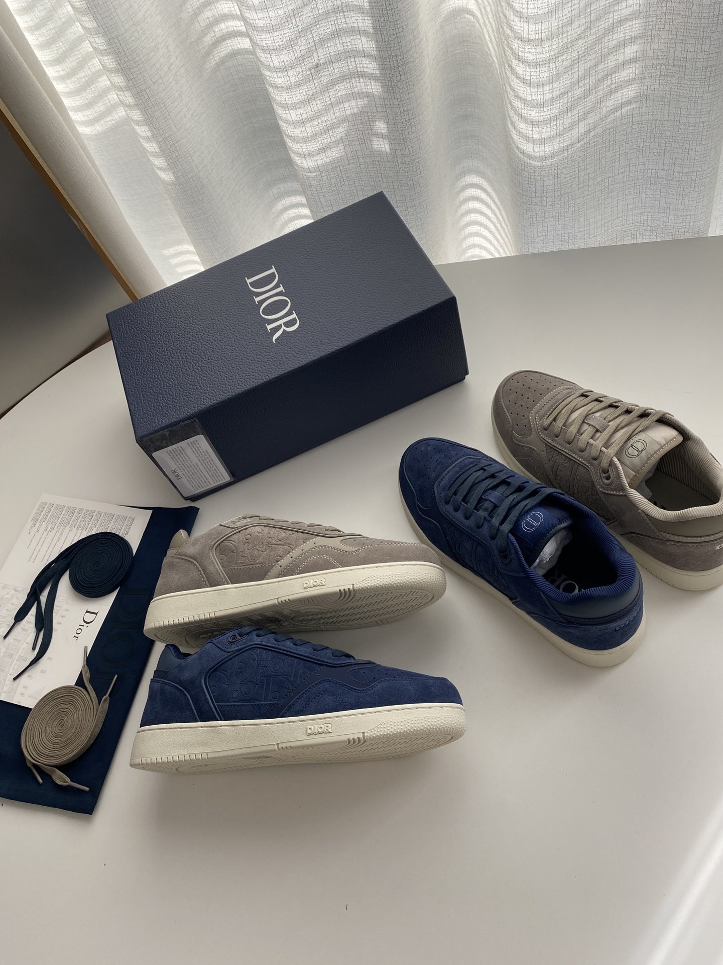 To maintain the pristine condition of your Dior sneakers, we recommend using a specialized suede brush for the upper and a soft, damp cloth for the rubber soles. Always store your shoes in the provided navy Dior dust bag and original box to protect them from direct light, heat, and humidity. Avoid contact with water or oily substances to preserve the suede's texture.