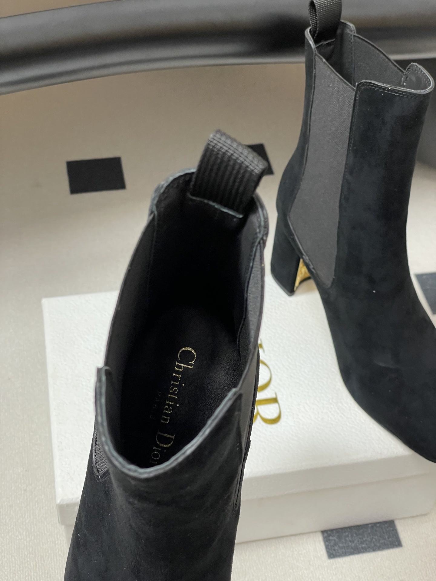 Step into the world of high fashion with these exquisite Dior ankle boots. Crafted from premium black suede calfskin, these boots represent the pinnacle of French luxury and sophisticated design. The sleek silhouette is complemented by the iconic Chelsea-style elastic side panels, ensuring a perfect fit and effortless wearability for the modern woman.