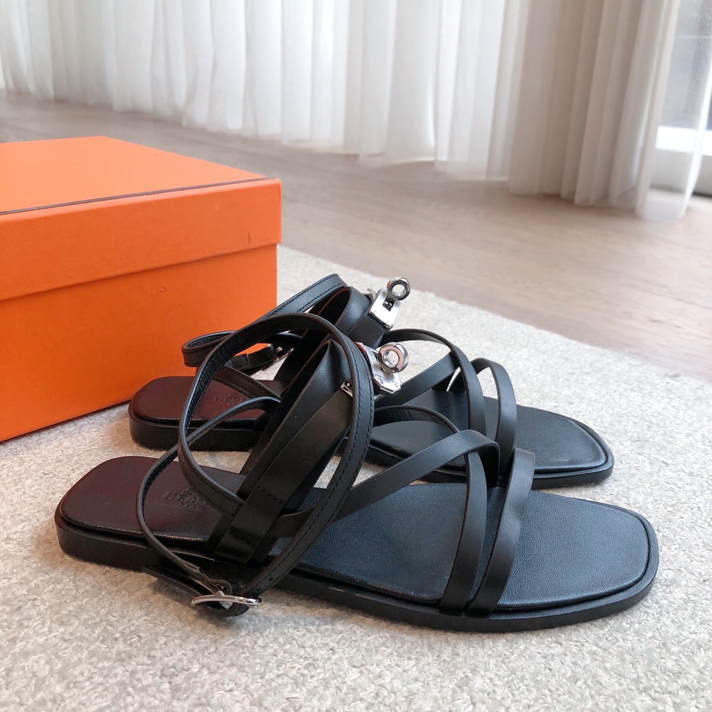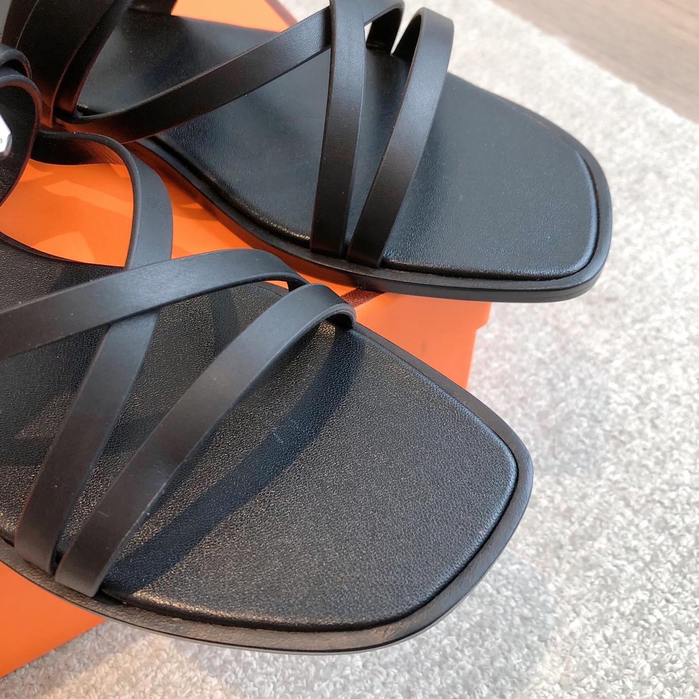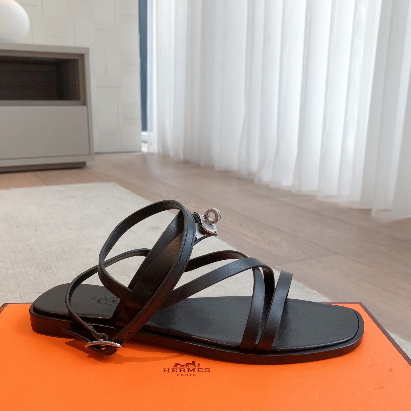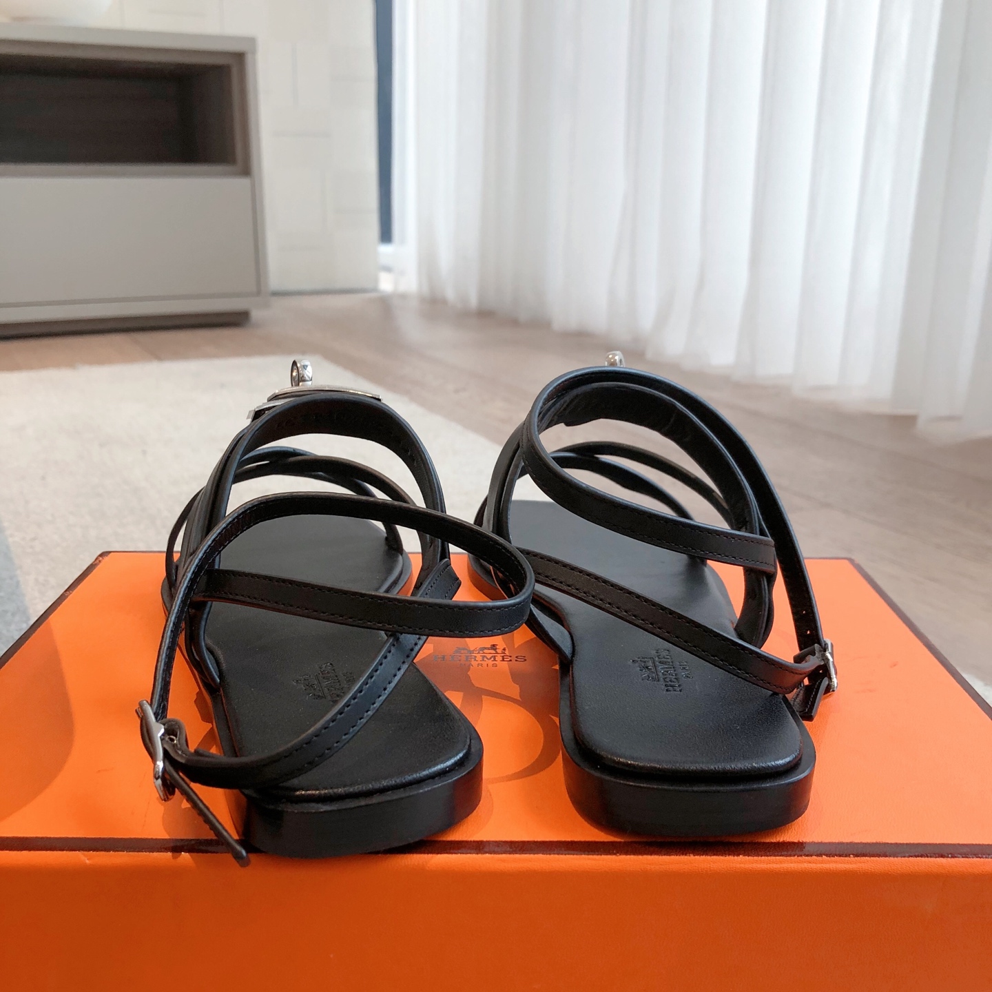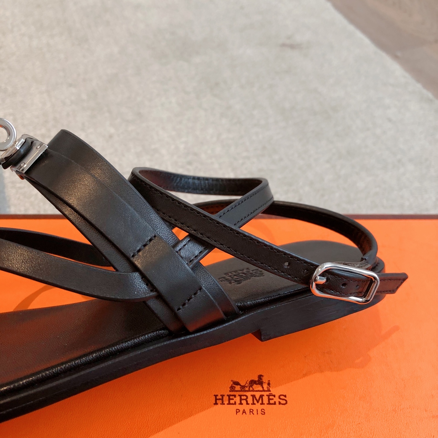 This is an authentic pair of HERMES Calfskin June Sandals in Black. These stylish sandals are crafted of leather in black. They feature a silver plated iconic Kelly buckle.