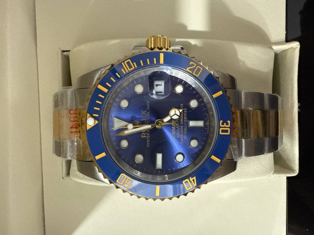 Rolex Oyster Perpetual Submariner Date 16613T Mens Watch. 40mm stainless steel case. Unidirectional rotating 18K yellow gold bezel with blue insert. Blue dial with Mercedes gold luminous hands. Minute maker on the outer dial. The date is displayed at the 3 o’clock position. Stainless steel & 18K yellow gold Oyster bracelet with stainless steel fold-over clasp with safety. Will fit up to a 6.5-inch wrist. Sapphire crystal. Stainless steel case back. Automatic self-winding movement.