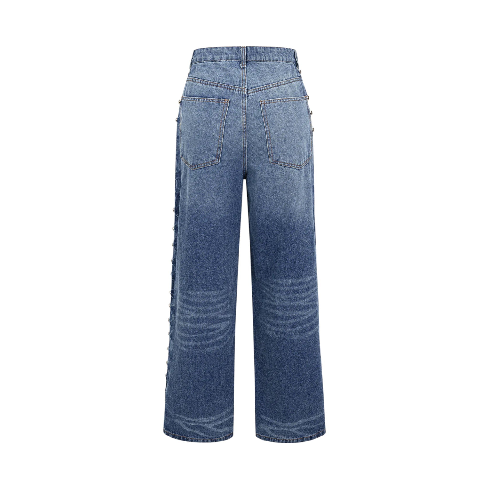 These women’s loose-fit jeans feature decorative rivet accents for a bold, modern take on classic denim. Designed for casual wear, the full-length silhouette offers a relaxed fit through the hips and legs, making them comfortable for all-day styling.