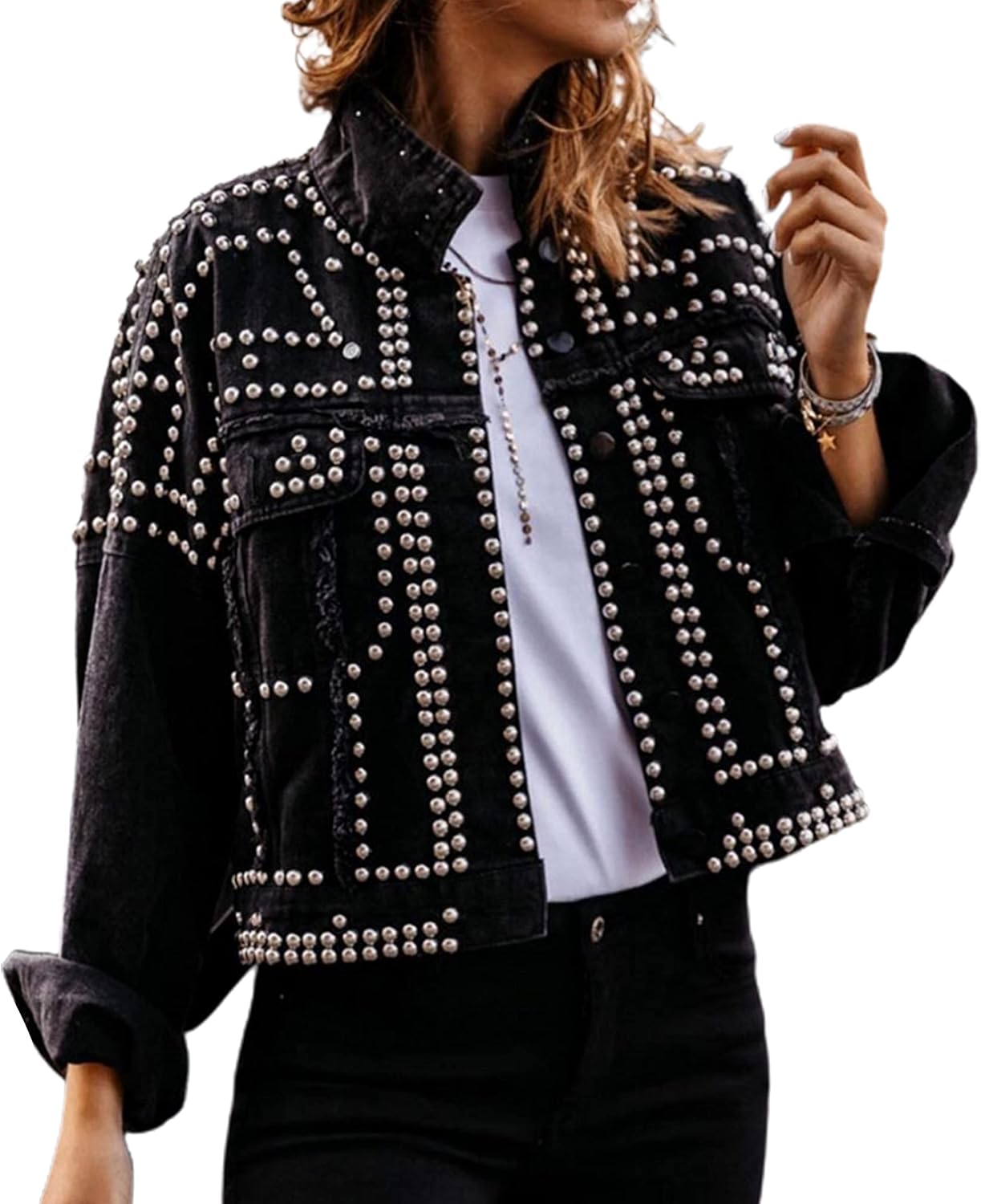 $41.98APAFES Women’s Fashion Crop Fringe Denim Jacket Distressed Western Studded Black Trucker Jacket