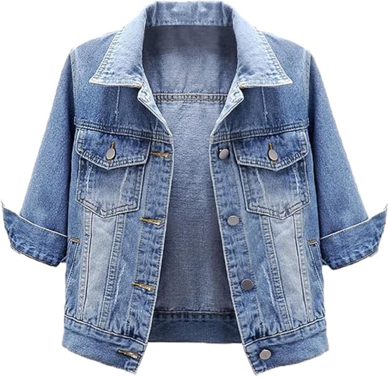 $37.99MINTLIMIT Women’s Cropped Denim Jacket 2025 Lapel Jean Coat Button Trendy 3\/4 Sleeve Stretch Short Plus Size Denim Jacket
