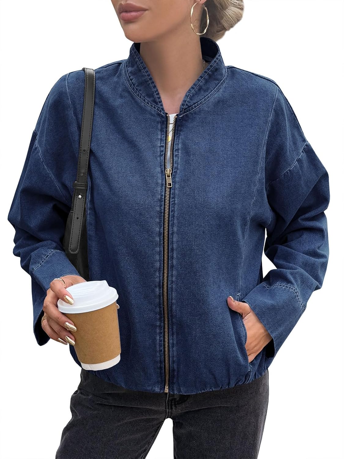 $29.99Tankaneo Womens Denim Bomber Jacket Zip Up Cropped Lightweight Jean Jacket Fall Casual Outerwear with Pockets